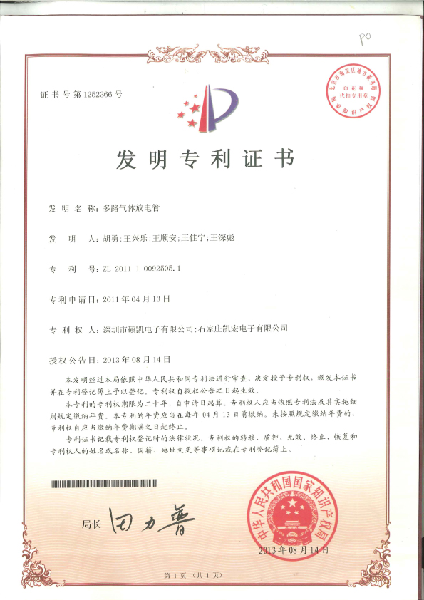 多路气体放电管发明专利证书