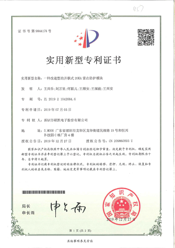 一种改进型的并联式20KA雷击防护模块实用新型专利证书