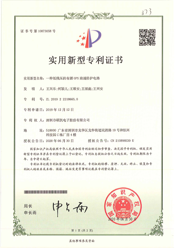 一种低残压的有源GPS浪涌防护电路实用新型专利证书