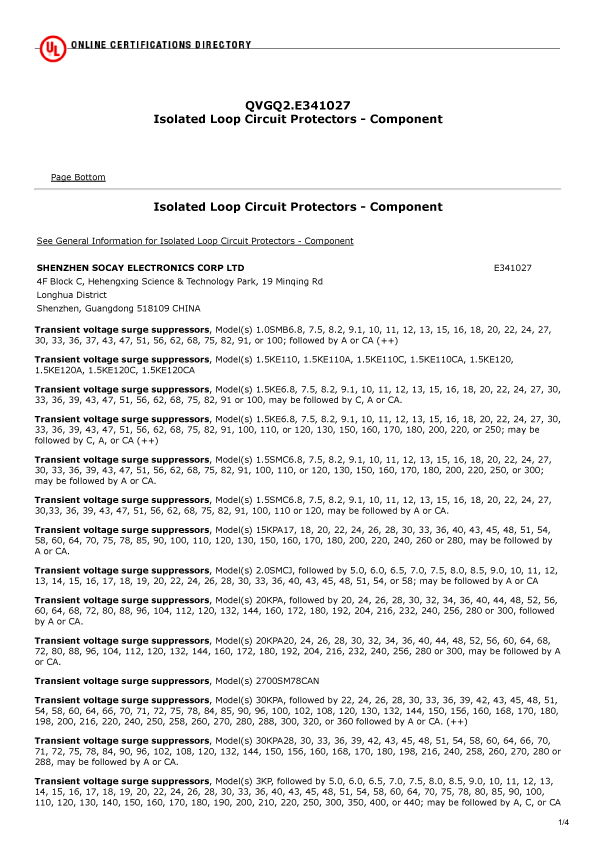瞬态抑制二极管UL证书(截取部分)