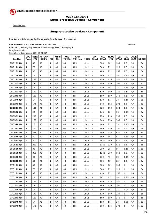 插件压敏电阻UL证书(截取部分)