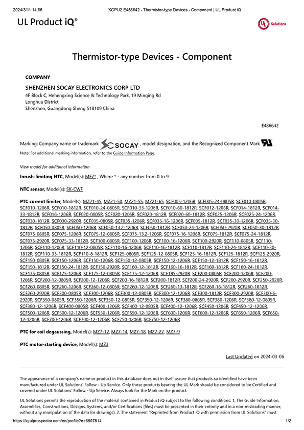 热敏电阻/贴片保险丝UL证书